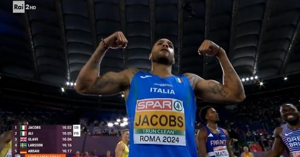 (LaPresse) Marcell Jacobs ha vinto la gara dei 100 metri maschili agli Europei di atletica di Roma. Il campione olimpico di Tokyo 2020 ha corso in 10"02. Al secondo posto, a completare una splendida doppietta, l’altro azzurro Chituru Ali che ha chiuso in 10"05. Terzo posto per il britannico Romell Grave (10"06). Rivediamo la fantastica gara dei due azzurri. RaiPlay