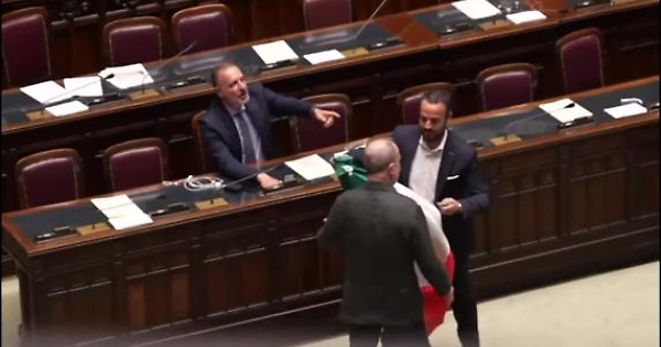 La rissa è scoppiata dopo che il deputato pentastellato aveva provato a portare il tricolore al ministro Calderoli, gesto censurato dal presidente della camera Lorenzo Fontana con l'espulsione.
