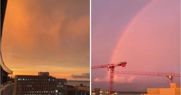 Lunedì sera, 15 luglio, gli osservatori del cielo del Wisconsin hanno potuto ammirare una rara combinazione di arcobaleni, fulmini e un caldo tramonto arancione presenti tutti insieme nello stesso momento.