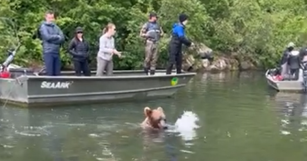 Lo scorso 5 luglio durante una battuta di pesca a Kenai, in Alaska, un uomo di nome Josh Aynes ha ripreso una scena curiosa: un orso che nuota beatamente nel laghetto, in mezzo alle barche dei pescatori, senza dare segni di preoccupazione o di agitazione per la vicinanza di quegli esseri umani sconosciuti.