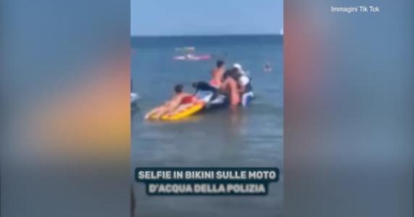Tre bagnanti in costume si scattano selfie e registrano video sulla moto d’acqua della polizia ormeggiati a pochi metri dalla riva. E’ accaduto a Chioggia, sulla spiaggia di Punta Canna a Sottomarina. La scena è stata ripresa da alcune persone presenti in spiaggia e il video postato su Tik Tok.