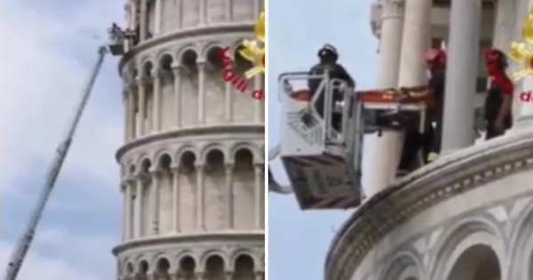 Uomo colto da un malore in cima alla Torre di Pisa: il video del salvataggio dei vigili del fuoco con l'autoscala