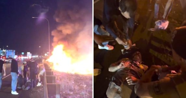Un gruppo di automobilisti di passaggio si sono fermati per prestare soccorso e sono riuciti ad avvicinarsi all'auto in fiamme. Hanno cercato di rompere i finestrini senza riuscirci ma, alla fine, hanno aperto la portiera e sono stati investiti da un ritorno di fiamma. Nonostante questo, hanno salvato il guidatore e sono riuciti a trascinarlo fuori. L'uomo è stato soccorso e ricoverato per le ustioni riportate.