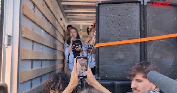 (LaPresse) Greta Thunberg alla manifestazione dei Fridays for Future a Milano parla dal palchetto improvvisato su un furgone, indossando una kefiah, e tocca ancora una volta la questione palesitinese, che l'ha vista in prima fila negli ultimi mesi.