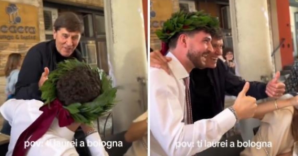 Gianni Morandi si imbatte in una festa di laurea a Bologna e si ferma per fare i complimenti: «Ce l'hai fatta!»