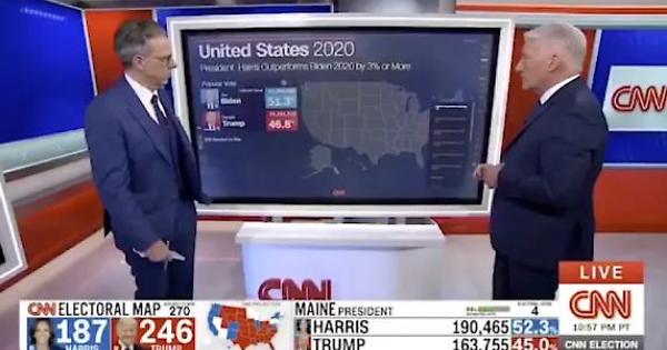 La «leggenda» delle mappe elettorali John King ha mostrato al collega Jake Tapper in quali distretti elettorali Harris era più forte di Biden di almeno il 3% nel 2020. Quando King ha cliccato sul touchscreen per visualizzare la vista corretta, Tapper è rimasto a bocca aperta. «Santo cielo!», ha esclamato l'esperto giornalista politico.