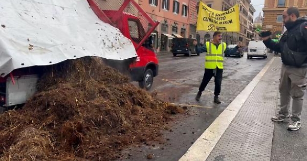 Gli eco attivisti scaricano quintali di letame davanti al Viminale contro le politiche climatiche del governo