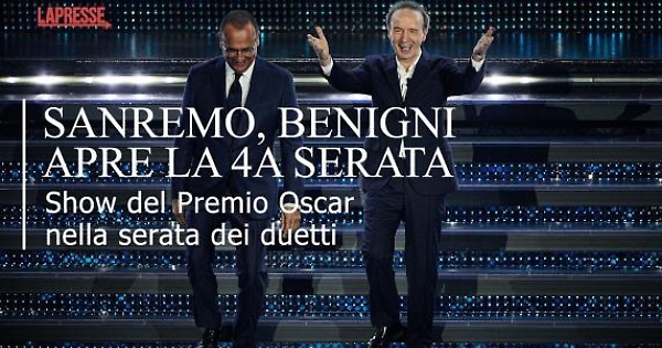 (LaPresse) - Roberto Benigni ha aperto la quarta serata di Sanremo dedicata ai duetti Il comico ha fatto i complimenti a Carlo Conti: «Tutti parlano del Festival. Hai bloccato l'Italia. Dovresti fare il ministro dei Trasporti. Non parliamo di politica, sennò la situazione è tesa. Dietro le quinte ho visto Marcella Bella, e le ho detto `Bella ciao!´E’ successo di tutto…»