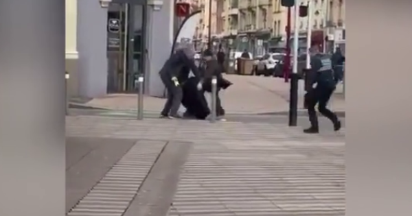 Nel video l'intervento della polizia che la ferma e le ordina di lasciare il coltello. Lei però non obbedisce e  questo scatena la reazione degli agenti all'angolo tra Place Corbis e Rue de l'As-de-Carreau. Gli agenti hanno usato il taser, ma non ha avuto effetto perché la donna indossava diversi strati di vestiti, così uno dei poliziotti è riuscito a disarmarla prendendola alle spalle. La donna è stata arrestata.