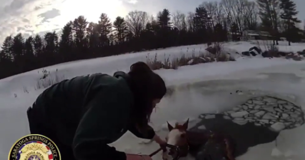 Un cavallo che  è precipitato nel ghiaccio di uno stagno a nord di New York è stato salvato dagli agenti di polizia che hanno collaborato per liberare l'animale dall'acqua gelida. Secondo il Dipartimento di polizia di Saratoga Springs, gli agenti hanno ricevuto una richiesta di aiuto e l'agente Kyle Clinton è arrivato per primo sul posto e ha iniziato ad aiutare il proprietario a tirare fuori il cavallo con una corda, ha dichiarato la polizia, «Gli agenti Kris Camarro e Dominic Martuscello sono arrivati poco dopo l'agente Clinton e hanno immediatamente iniziato ad aiutare a tirare il cavallo fuori dall'acqua».
