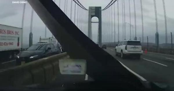 Il video, ripreso sul ponte di Verrazzano a New York, mostra una grossa tavola di legno che vola via da un pick-up e colpisce il parabrezza di un'auto che procede nella direzione opposta. Un uomo fuori dal camion cercava di mettere in sicurezza la tavola quando è volata in aria, sull'altra carreggiata. Nonostante l'intero parabrezza sia andato in frantumi, fortunatamente nessuno è rimasto ferito.