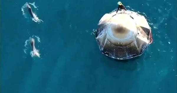 I delfini circondano la navicella spaziale appena ammarata e danno il bentornato agli astronauti