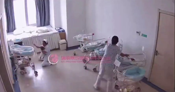 Si vedono i professionisti sanitari che si precipitano a tenere le culle per  impedire che rotolino via durante le violente scosse del terremoto di magnitudo 7,7.