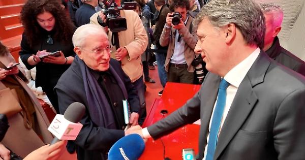 «È stato un piacere vederti, Marcello», dice l'ex premier stingendo la mano a Dell'Utri. «Potete dire  che sono un suo ammiratore».  Un giornalista azzarda: Ma meglio Berlusconi o Renzi? «Ma Renzi non è mica morto», risponde Dell'Utri con Renzi che chiosa: «Questa non è male.»