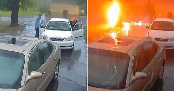Una telecamera di sicurezza ha ripreso il momento terrificante in cui una coppia è sfuggita per poco alla morte quando un fulmine li ha colpiti pochi secondi dopo essere saliti in macchina, nel bel mezzo di uno dei tanti intensi temporali che hanno colpito lo stato americano dell'Arkansas negli ultimi giorni.