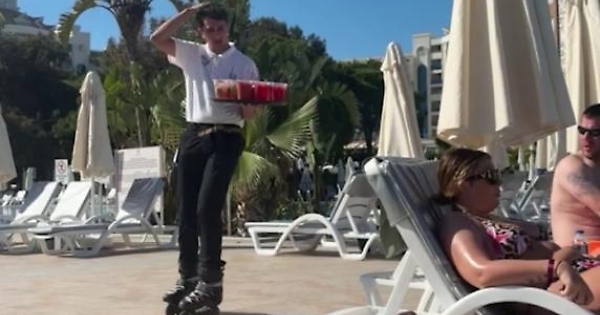Una ragazza inglese di nome Emma Guthrie era in vacanza ad Antalya, in Turchia, lo scorso 3 aprile quando ha filmato una scena comica: Il cameriere del villaggio turistico è comparso d'un tratto sui pattini, tenendo in equilibrio con sicurezza un vassoio di bevande, finché non è successo il disastro. In una frazione di secondo, il vassoio si è ribaltato e le bevande sono volate ovunque. (Caters News)