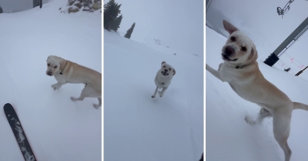 Jack Skidmore, un cittadino statunitense del Colorado, adora andare in vacanza in montagna con il suo cane Labrador: mentre lui affronta i pendii innevati con gli sci, il suo energico cane gli corre accanto, con la coda che scodinzola, le orecchie che sbattono e tanti salti felici nella neve. (Caters News)