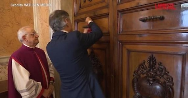 (LaPresse) Le immagini dell'apposizione dei sigilli nell'appartamento papale al terzo piano del Palazzo Apostolico in Vaticano dopo la morte di Papa Francesco. L'applicazione dei sigilli, che significano la fine del pontificato di Bergoglio, è avvenuta dopo il rito della constatazione della sua morte, che è avvenuta questa mattina, lunedì, alle 7:35. Sigilli sono stati apposti anche a Casa Santa Marta, la residenza abituale del Papa. Resteranno, secondo le norme, fino alla nomina del nuovo Papa. Le reazioni dal mondo alla morte del Pontefice.