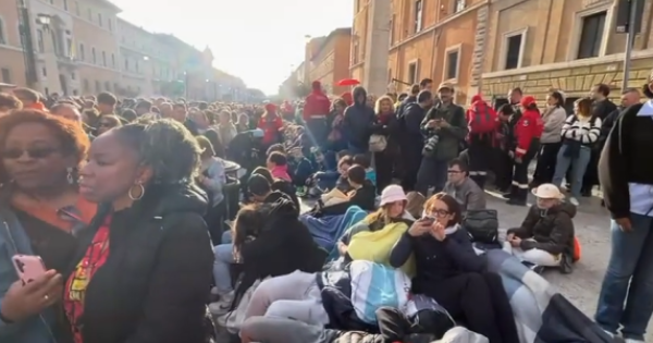 Al varco di lungotevere in Sassia sono centinaia le persone in fila in attesa di superare i controlli per l'accesso a via della Conciliazione, con metal detector e verifiche delle forze dell'ordine su zaini e borse.
