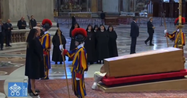 Trump omaggia il feretro di Papa Francesco: Melania con il capo coperto da una veletta nera a lutto