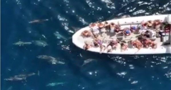 Il branco di delfini scorta la nave dei turisti: le formidabili immagini riprese dal drone
