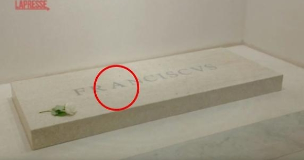 (LaPresse) Un errore grafico sulla lapide che chiude la tomba di Papa Francesco in Santa Maria Maggiore. Le lettere che compongono la parola 'Franciscus' non sono infatti tutte alla stessa distanza. Si nota una maggiore distanza tra la 'R', la 'A' e la 'N' e poi di nuovo prima della 'V'.