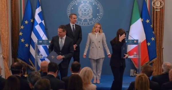 Una lunga serie di foto di rito che celebrano gli accordi stipulati tra Italia e Grecia, a conclusione del vertice bilaterale a Villa Pamphili, mette a dura prova la resistenza di Giorgia Meloni. La premier, che assiste a tutta la cerimonia accanto al primo ministro greco Kyriakos Mitsotakis, si lascia andare ad un momento di insofferenza per la lunga serie di foto istituzionali. La presidente del Consiglio allarga due volte le braccia e sbuffa spazientita prima di prendere posto davanti al leggio per le dichiarazioni congiunte con Mitsotakis.